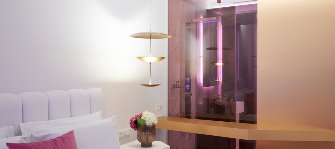 Cette belle chambre dispose d’une spacieuse chambre twin, au design raffiné, avec portes et placards aux finitions argentées, un éclairage indirect élégant, ainsi qu’une salle de bains privative équipée d’une douche contemporaine avec système de jets hydromassants et de produits d’accueil de marque.